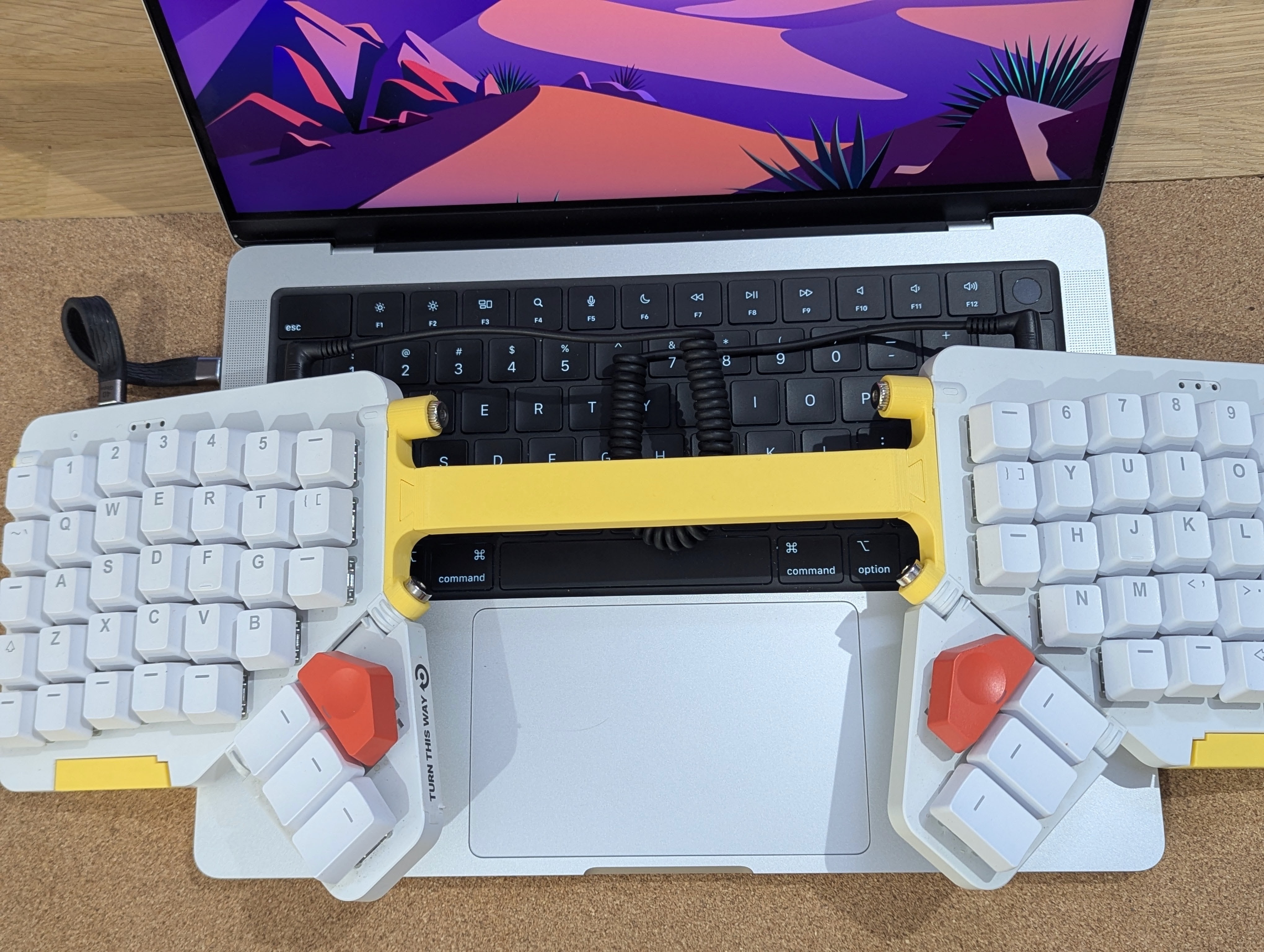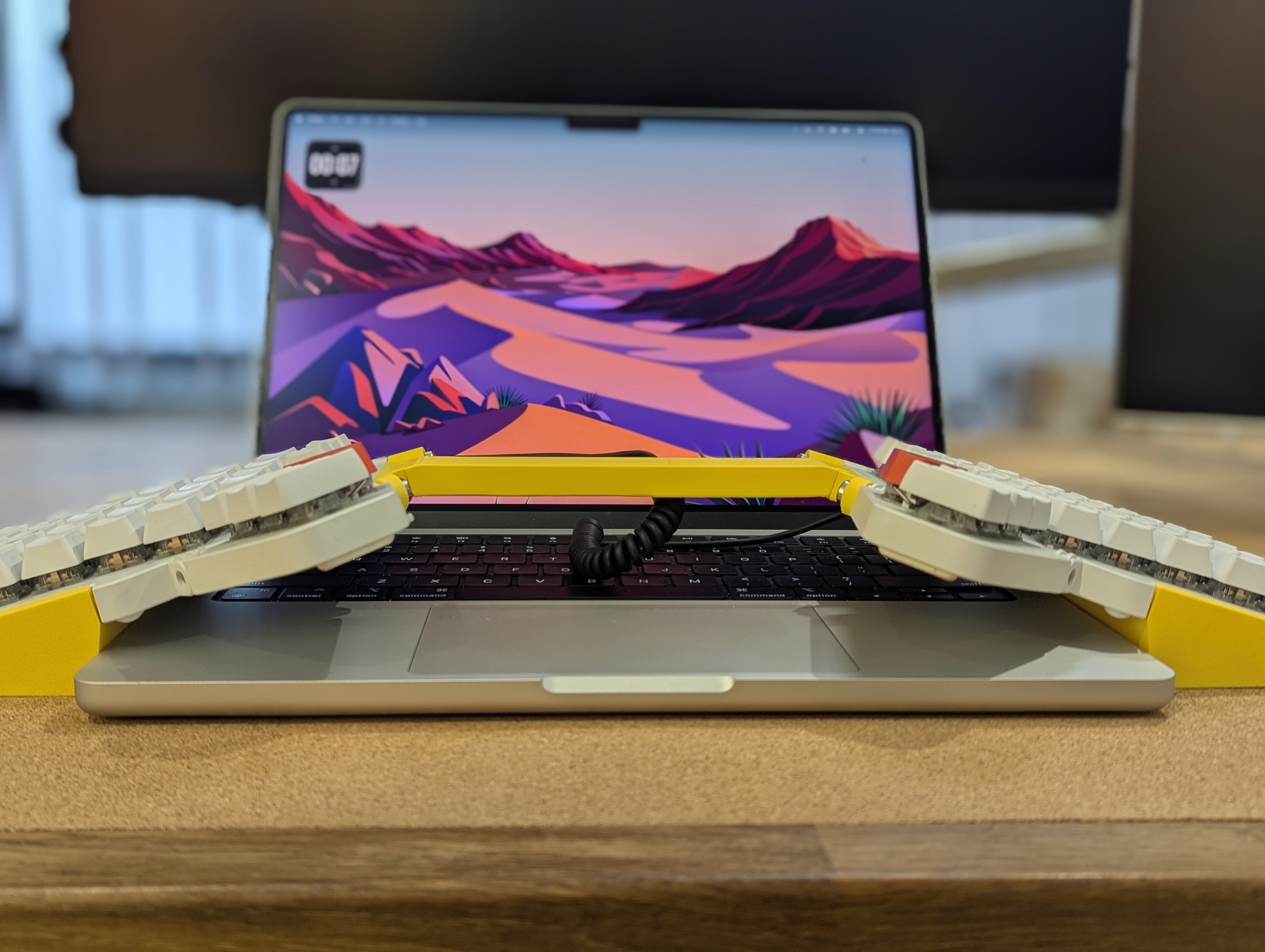 It should help me to have a perfect setup everywhere, very low horizontal footprint as it sits on top of the laptop, but a very good typing experience. And that was the goal.